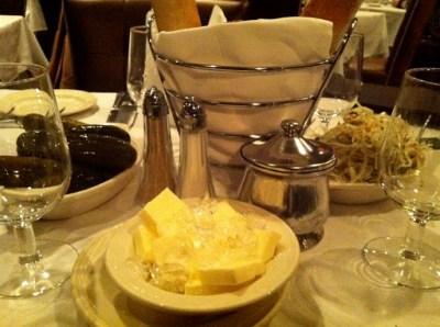 The stuff legends are made of – Moishes’ pickles and coleslaw, and lots of butter.